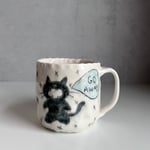 This mug was thrown with frost porcelain clay and then pinched. This porcelain has a strong white color. The drawings on this mug are made with a black underglaze pencil and rap around the entire mug. Each drawing is filled with a colored glaze. The entire mug is dipped in a clear glaze and fired in an electric kiln. All mugs have 8-12 different glazes. This mug is microwave and dishwasher safe!