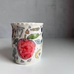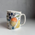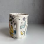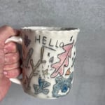 This mug was thrown with frost porcelain clay and then pinched. This porcelain has a strong white color. The drawings on this mug are made with a black underglaze pencil and rap around the entire mug. Each drawing is filled with a colored glaze. The entire mug is dipped in a clear glaze and fired in an electric kiln. All mugs have 8-12 different glazes. This mug is microwave and dishwasher safe!