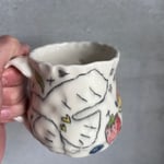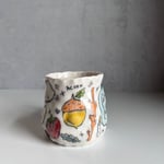 This mug was thrown with frost porcelain clay and then pinched. This porcelain has a strong white color. The drawings on this mug are made with a black underglaze pencil and rap around the entire mug. Each drawing is filled with a colored glaze. The entire mug is dipped in a clear glaze and fired in an electric kiln. All mugs have 8-12 different glazes. This mug is microwave and dishwasher safe!