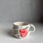 This mug was thrown with frost porcelain clay and then pinched. This porcelain has a strong white color. The drawings on this mug are made with a black underglaze pencil and rap around the entire mug. Each drawing is filled with a colored glaze. The entire mug is dipped in a clear glaze and fired in an electric kiln. All mugs have 8-12 different glazes. This mug is microwave and dishwasher safe!
