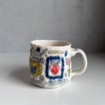This mug was thrown with frost porcelain clay and then pinched. This porcelain has a strong white color. The drawings on this mug are made with a black underglaze pencil and rap around the entire mug. Each drawing is filled with a colored glaze. The entire mug is dipped in a clear glaze and fired in an electric kiln. All mugs have 8-12 different glazes. This mug is microwave and dishwasher safe!