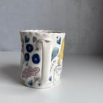 This mug was thrown with frost porcelain clay and then pinched. This porcelain has a strong white color. The drawings on this mug are made with a black underglaze pencil and rap around the entire mug. Each drawing is filled with a colored glaze. The entire mug is dipped in a clear glaze and fired in an electric kiln. All mugs have 8-12 different glazes. This mug is microwave and dishwasher safe!
