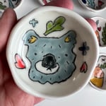 This dish was made with frost porcelain clay. This porcelain has a strong white color. The drawings on this dish are made with a black underglaze pencil. Each drawing is filled with a colored glaze. The dish is dipped in a clear glaze and fired in an electric kiln. All tiny dishes have several different glazes used on them. This piece is microwave and dishwasher safe!