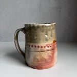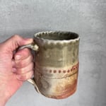 This is a mug that was thrown with a stoneware clay specifically used for wood kilns. It was pinched throughout and has a hand pulled handle. It was fired for over 24hrs and soda was added at the end of the firing. This mug was glazed with a celadon glaze and pink dots. A black underglaze pencil was used underneath. Each wood fired mug is unique.