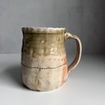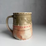 This is a mug that was thrown with a stoneware clay specifically used for wood kilns. It was pinched throughout and has a hand pulled handle. It was fired for over 24hrs and soda was added at the end of the firing. This mug was glazed with a celadon glaze and pink dots. A black underglaze pencil was used underneath. Each wood fired mug is unique.