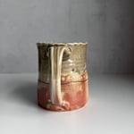 This is a mug that was thrown with a stoneware clay specifically used for wood kilns. It was pinched throughout and has a hand pulled handle. It was fired for over 24hrs and soda was added at the end of the firing. This mug was glazed with a celadon glaze. A black underglaze pencil was used underneath. Each wood fired mug is unique.